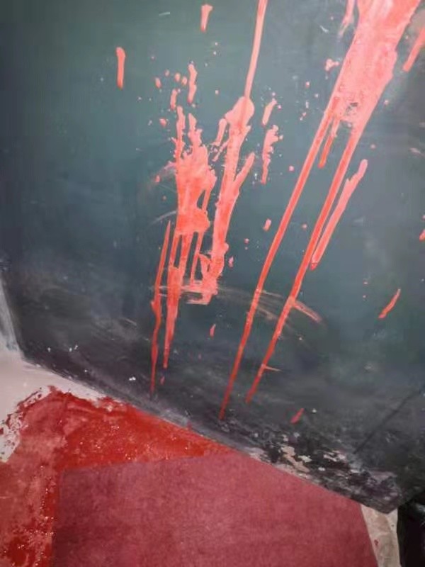 “外卖吃完大约1小时后,外卖员回来找我索要外卖。我和他说‘外卖我吃完了,外卖的主人说送给我,她说她已经和您联系过了’。在和外卖员沟通时,我也给夏女士打了电话,但是没打通。听我这么说之后,外卖员便让我出这份外卖的钱,我让他去和外卖的主人联系。他找我要了外卖单,就在我家门口捯饬手机。考虑到冷,我又骨折了,我就把门给关上了。约摸过了半小时,我闻到一股油漆味,并且听见门外有声音,我就开门去看,发现门上被泼了红色油漆。我开门的时候,看到外卖员从楼梯上下去。”张女士称。