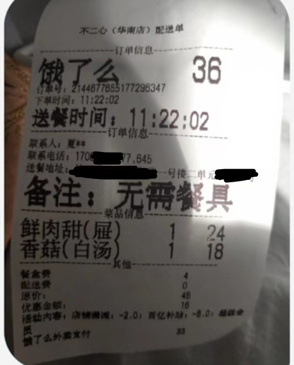 张女士告诉澎湃新闻,23日中午,一份有“鲜肉甜”和“香菇白汤”的外卖送到她家,总价33元,“我自己没点外卖,以为是我男朋友给我点的,问我了我男朋友,他说他也没点。后来一看外卖单子,上面写的是一号楼二单元,我家是一号楼一单元,这才明白是外卖员送错了。”