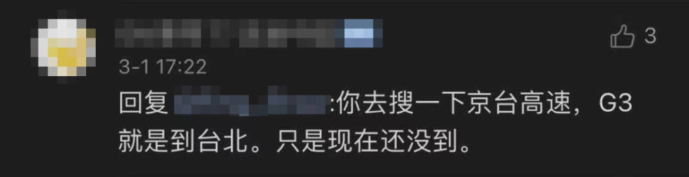 这位网友介绍,G3京台高速一直都有,只是目前暂时没通到台北。下面则有留言提出疑问,称“京台高速”中的“台”莫不是指的浙江台州?