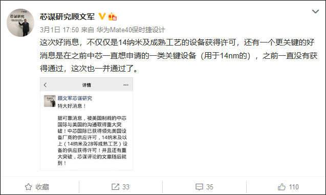 3月1日,半导体行业研究机构芯谋研究首席分析师顾文军也发微博称,中芯国际之前一直有申请但未获通过的一类关键设备(用于14nm),此次也获得通过。