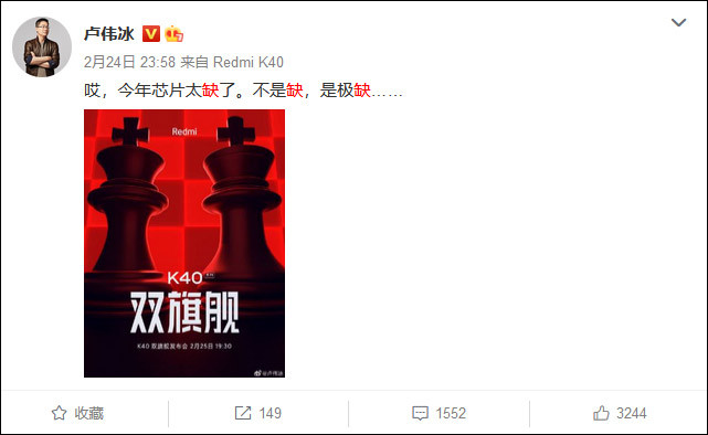 小米中国区总裁卢伟冰甚至在个人微博上坦言:“今年芯片缺货,不是缺,而是极缺。”