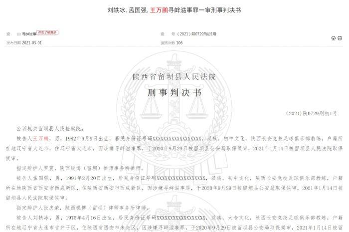 中国裁判文书网日前登出了陕西省留坝县人民法院的一则刑事判决书。判决书显示,陕西长安竞技足球俱乐部教练王万鹏以及孟国强、刘轶冰因犯寻衅滋事罪,分别被判缓刑。