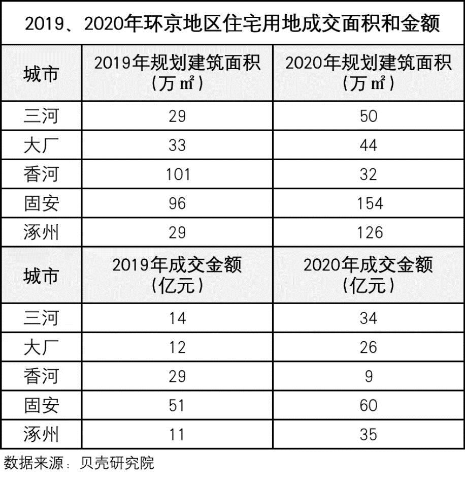 来自贝壳研究院的统计数据显示,跟2019年相比,2020年环京区域中,燕郊所在的三河、大厂、固安、涿州土地成交面积和金额均有不同程度的增长,其中固安两项均为最高值,涿州则增速最快,土地成交面积、成交金额分别增长超过300%、200%。