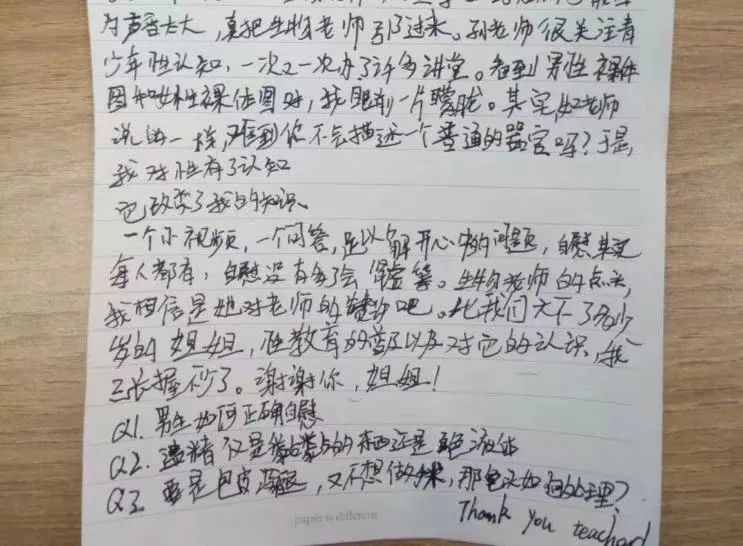 冉莉琴已经不介意有学生说她的课恶心,有学生给她写信,“老师我知道手淫没什么羞耻的,这很正常,我不害怕了。”她告诉学生,把性教育课当成工具,你现在放到你的工具箱里面,需要的时候拿出来用,就不会那么着急了。