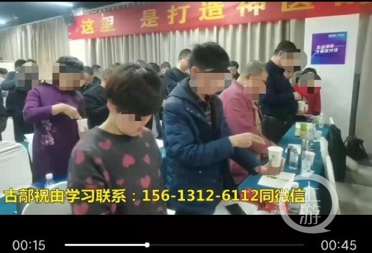 另一段视频显示,在一间会议室内,一群人左手端着纸杯,右手食中两指在纸杯上方摇晃,然后喝下了杯中水。一名女子说:“我告诉自己,这是上天赐予的神水,喝了之后,胸部的花斑癣变淡了……”