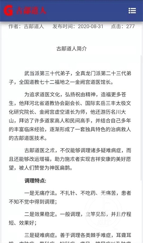 宣传网站上的“神医”古鄗道人,声称“被赞誉为神医扁鹊”