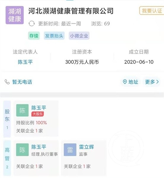 工商信息显示,河北滨湖健康管理有限公司的经营范围是:健康管理咨询(医疗、诊疗除外);会议服务;企业形象策划;市场营销策划;设计、制作、代理发布国内广告业务;一类医疗器械、日用品、化妆品零售。