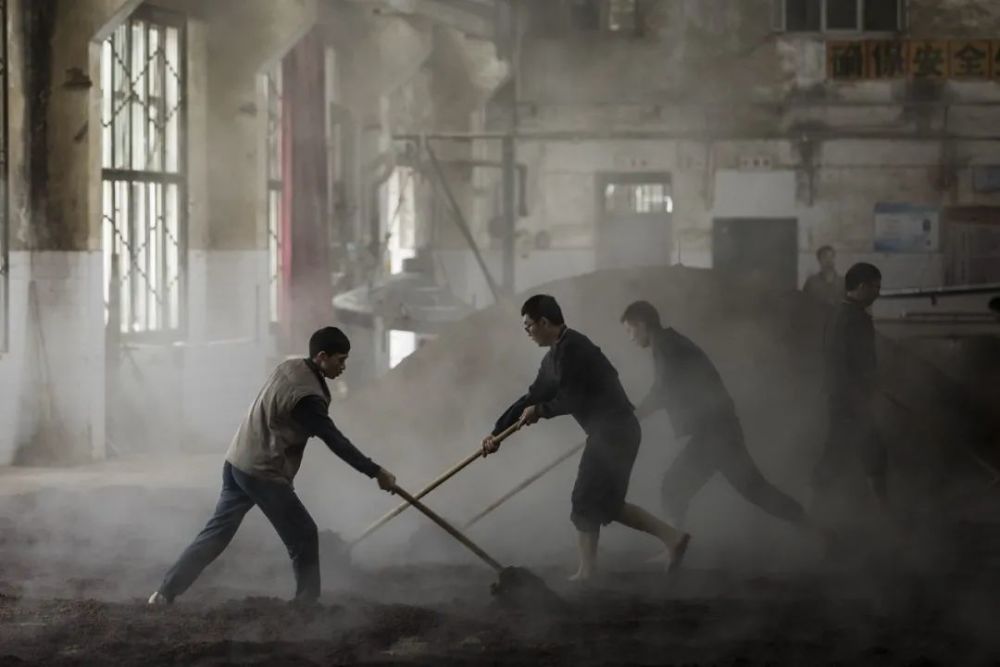 茅台酒厂的车间就像一个空旷但不长草的足球场,地上堆放着发酵的高粱,周亮的工作就是把高粱铲到一个不锈钢蒸笼里,以及光着脚在高粱上踩来踩去,像是海边的人踩沙子。