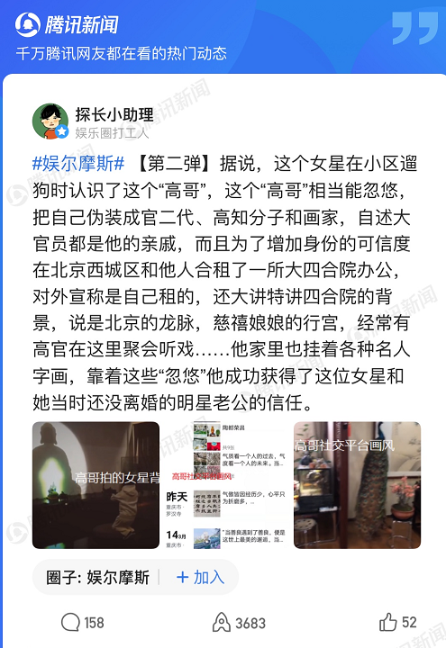 24日,有自媒体八卦密探长在腾讯新闻爆料,某女星因出轨退圈,不但直播被封杀,谋求复出还被骗1200万。