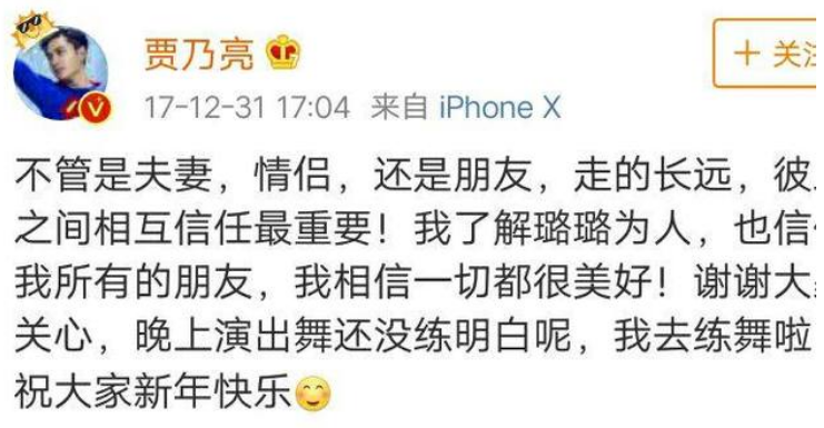 虽然2017年12月29日夜宿门发生后,贾乃亮第一时间在社交平台发声,一个多月后的2018年2月1日李小璐工作室也发声明维权,但双方却并没有真正对“夜宿门”事件有所回应。
