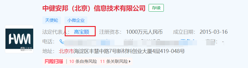 虽然企查查上的中健安邦相关信息,法人是高宝顺,而非高连峰。但高连峰的控股占比是98%。