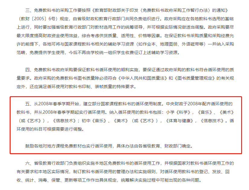 在2007年,教育部和财政部联合印发的《关于全面实施农村义务教育教科书免费提供和做好部分教科书循环使用工作的意见》中,对纳入循环使用的教科书进行了明确,即小学的《科学》《音乐》《美术》(或《艺术》)《信息技术》。初中的《音乐》《美术》(或《艺术》)《体育与健康》《信息技术》。同时,《意见》也提到,循环使用的科目可根据需要进行调整。