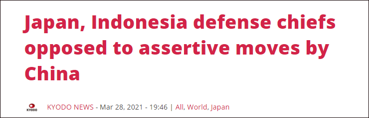 3月28日,日本防务大臣岸信夫与印尼防长普拉博沃举行会谈,并在会后举行的新闻发布会上表示,双方同意加强防务合作,并在南海举行联合演习。岸信夫宣称,此举是为了“对抗来自中国的威胁”,还敦促中国不要“试图单方面改变南海和东海的现状”。