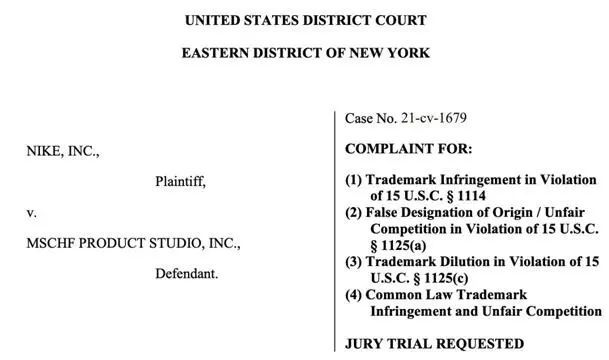 耐克向美国纽约东区联邦地区法院控告MSCHF
