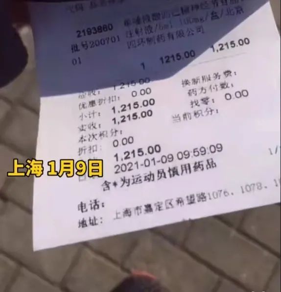 视频里,上海嘉定一名男子在医生的要求下,在医院外的药房购买了一支5ml的“单唾液酸酸四己糖神经节苷脂钠”,这一支药标价高达1215元。